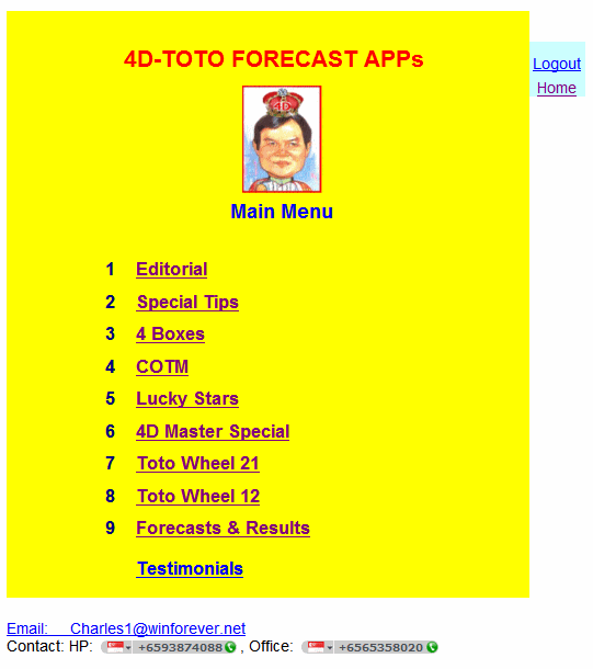 Dear 4D/Toto players, As more and more people own smart phones and other mobile internet devices, I feel it is about time that I develop 4D-Toto Forecast Apps for such devices so that they can access them on the go. From the valuable feedback from our readers, I have decided to develop web-based 4D-Toto apps so that as many users as possible can access these apps with different devices and platforms. The web-based Apps can be accessed by smart phones, PDAs, tablets, laptops, notebooks, desktop PCs, Mac PCs, smart TVs and any other devices that have internet connection. Isn¨t this a wonderful idea? My Credentials As many of you already know, I am the founder, author, publisher of the popular 4-D WINNING BOX magazine. I have been providing various 4D Forecast services since I first published my monthly magazine, 4-D WINNING BOX in Jan 1991. My mission is to provide the best lottery forecast services in Singapore and Malaysia. Over the last 30 years, I have introduced many forms and methods of lottery forecasts such as through personal consultation, magazine, eWinBox, Whatsapp, emails, and the Elite Player Plan. Many of our readers have benefitted from my services. I have helped thousands of my clients won Top-3 prizes. You have probably read about the numerous testimonies and success stories in our magazine, e4DWinBox and website. The fact that we are in business for more than 30 years speaks for itself. If U are still looking for the best 4D-Toto Forecast Apps, look no further. This is it! 4D-Toto Forecast Apps On-The-Go To keep up with the latest trend, I have now developed web-based 4D-Toto Forecast Apps for various popular 4D andToto Forecasts for mobile and portable devices. Though the Apps are optimised and customised for mobile and portable devices, any other devices can also access the Apps as long as there is an internet connection. Yes, U now have the convenience in accessing the Apps on-the-go with your mobile and portable devices. Do U often forget to bring my 4D magazine along and suddenly U want to know what good 4Ds to buy? No problem, just pull out your smartphone, log in and check out the Apps on-line instantly. What You Get in 4D-Toto Forecast Apps Now you can access the 4D-Toto Forecast Apps almost anytime and anywhere. The six main forecast modules in the 4D-Toto Forecast Apps are depicted in the screen shot below.